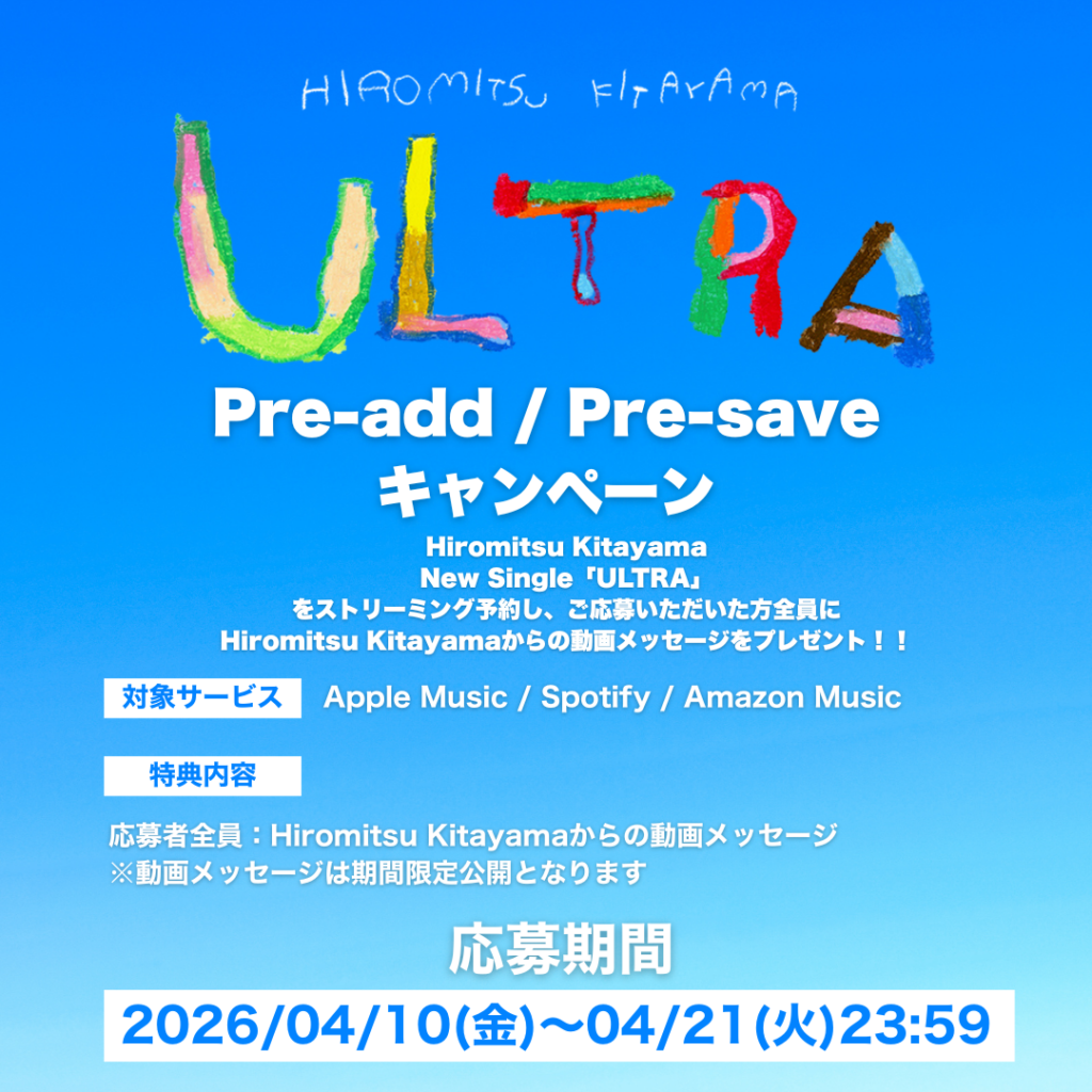 2026年4月22日(水)に配信されるHiromitsu Kitayamaの最新SG「ULTRA」をキャンペーンURLからApple Music・Spotify・Amazon Musicで期間内にストリーミング事前予約(Pre-Add / Pre-save)してくださった方全員に、Hiromitsu Kitayamaのスペシャル動画メッセージをプレゼント!